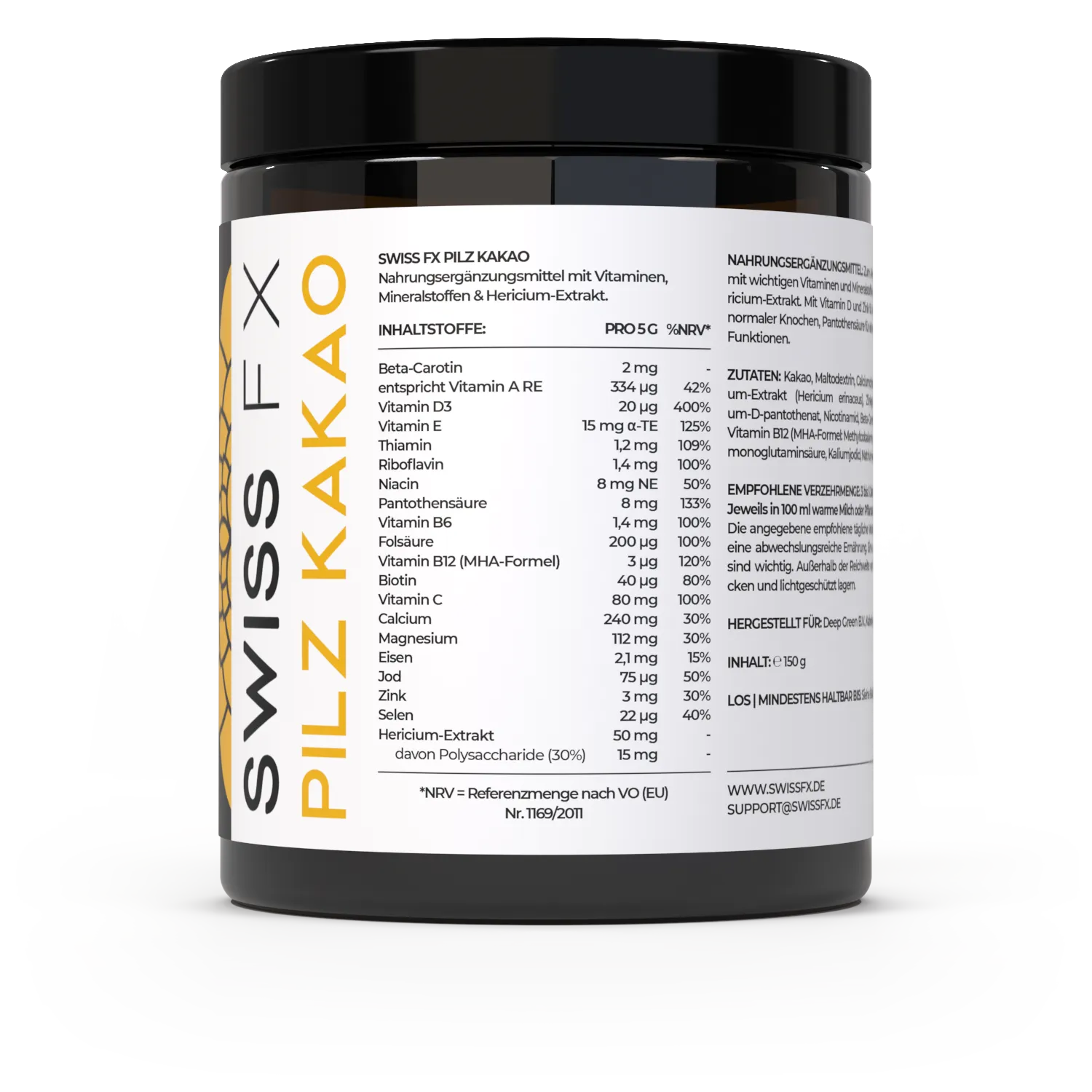 Der SWISS FX Pilz Kakao kombiniert hochwertigen, aromatischen Kakao mit einer nährstoffreichen Formel aus Vitaminen, Mineralstoffen und Hericium-Extrakt (Löwenmähne). Er wurde speziell dafür entwickelt, Kinder ab 3 Jahren im Alltag zu unterstützen – vom Kindergarten bis zur Schule. Die sorgfältig abgestimmte Rezeptur versorgt den Körper täglich mit wichtigen Mikronährstoffen, die Immunsystem, Konzentration, Wachstum und Energiehaushalt unterstützen können.