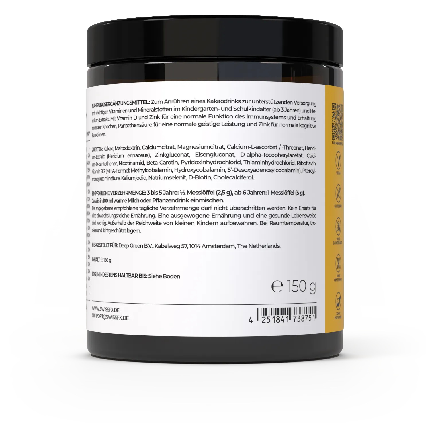 Der SWISS FX Pilz Kakao kann zum normalen Immunsystem beitragen, die geistige Leistungsfähigkeit unterstützen, die Knochenentwicklung fördern und den Energiestoffwechsel regulieren. Durch die sorgfältig gewählten Inhaltsstoffe ist er sowohl für jüngere Kinder (3–5 Jahre) als auch für Schulkinder geeignet.