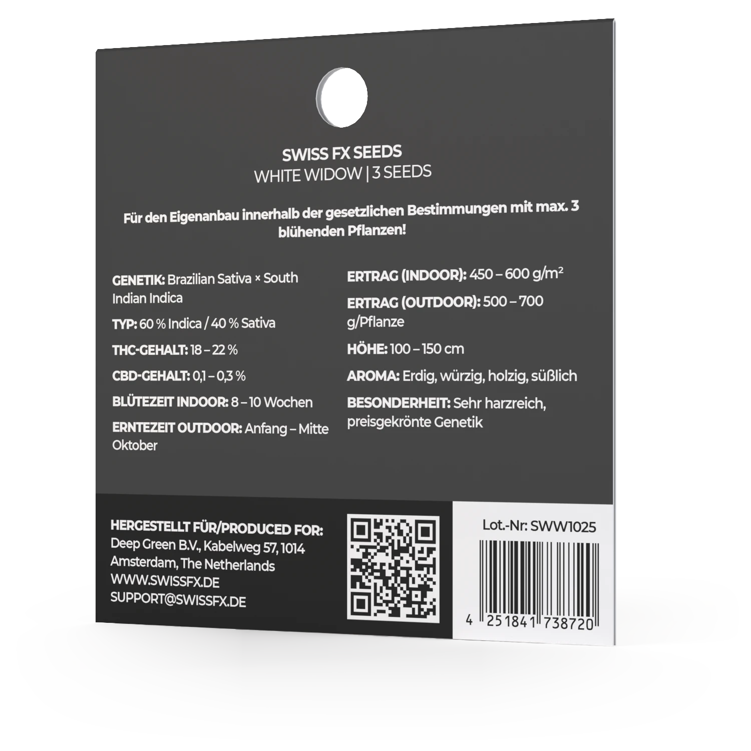 White Widow bleibt im Anbau kompakt, wächst kräftig und benötigt eine Blütezeit von 8 bis 10 Wochen. Sowohl im Innen- als auch im Außenbereich überzeugt sie durch ihre Robustheit und die Produktion dichter, harzreicher Blütenstände. Ihre klassisch erdigen, leicht holzigen Aromen machen sie zu einer Sorte, die sowohl geschmacklich als auch in ihrer Wirkung ein ausgewogenes Profil bietet.