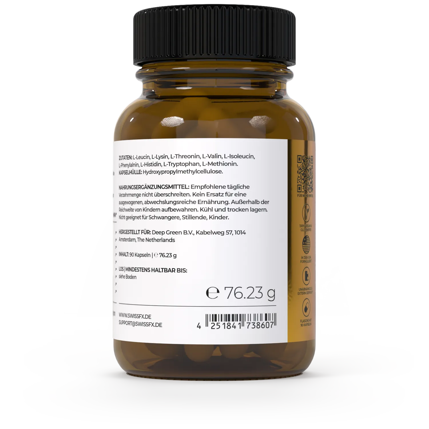 Wir verwenden ausschließlich vegane Rohstoffe ohne künstliche Zusatzstoffe, Farbstoffe oder Konservierungsmittel. Die Produktion erfolgt nach pharmazeutischen Standards in einem kontrollierten Umfeld, um die Bioverfügbarkeit und Stabilität der Aminosäuren zu gewährleisten.