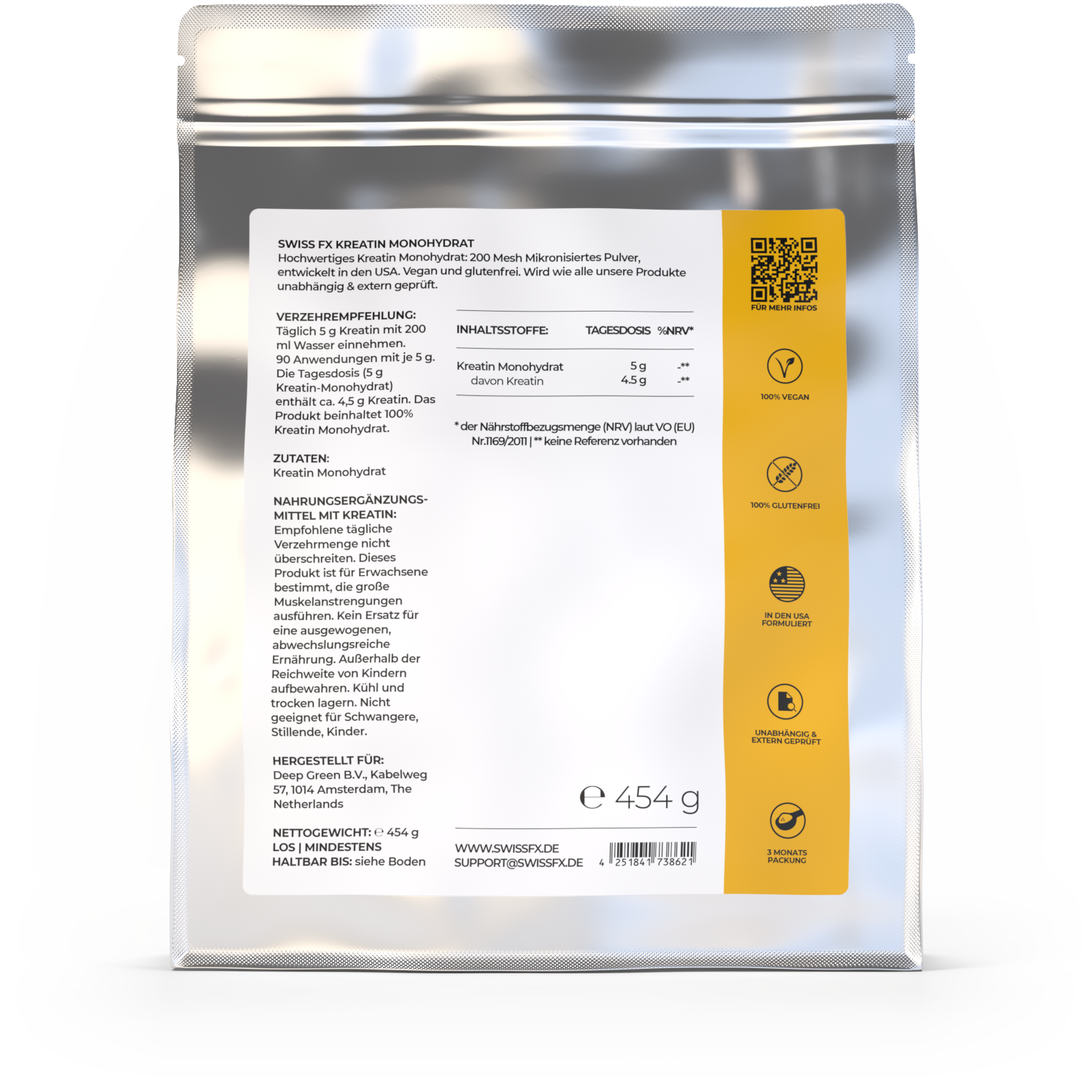 Die SWISS FX Kreatin Monohydrat Pulver liefert reinstes, mikrofeines Kreatin in höchster Qualität – für maximale Energie, Kraft und Leistungsfähigkeit. Kreatin ist ein körpereigener Stoff, der in Muskeln und Gehirn gespeichert wird und dort als kurzfristige Energiereserve dient. Es unterstützt die Bildung von ATP, der zentralen Energiequelle deiner Zellen, und kann dadurch sowohl physische als auch mentale Leistungsfähigkeit deutlich steigern.