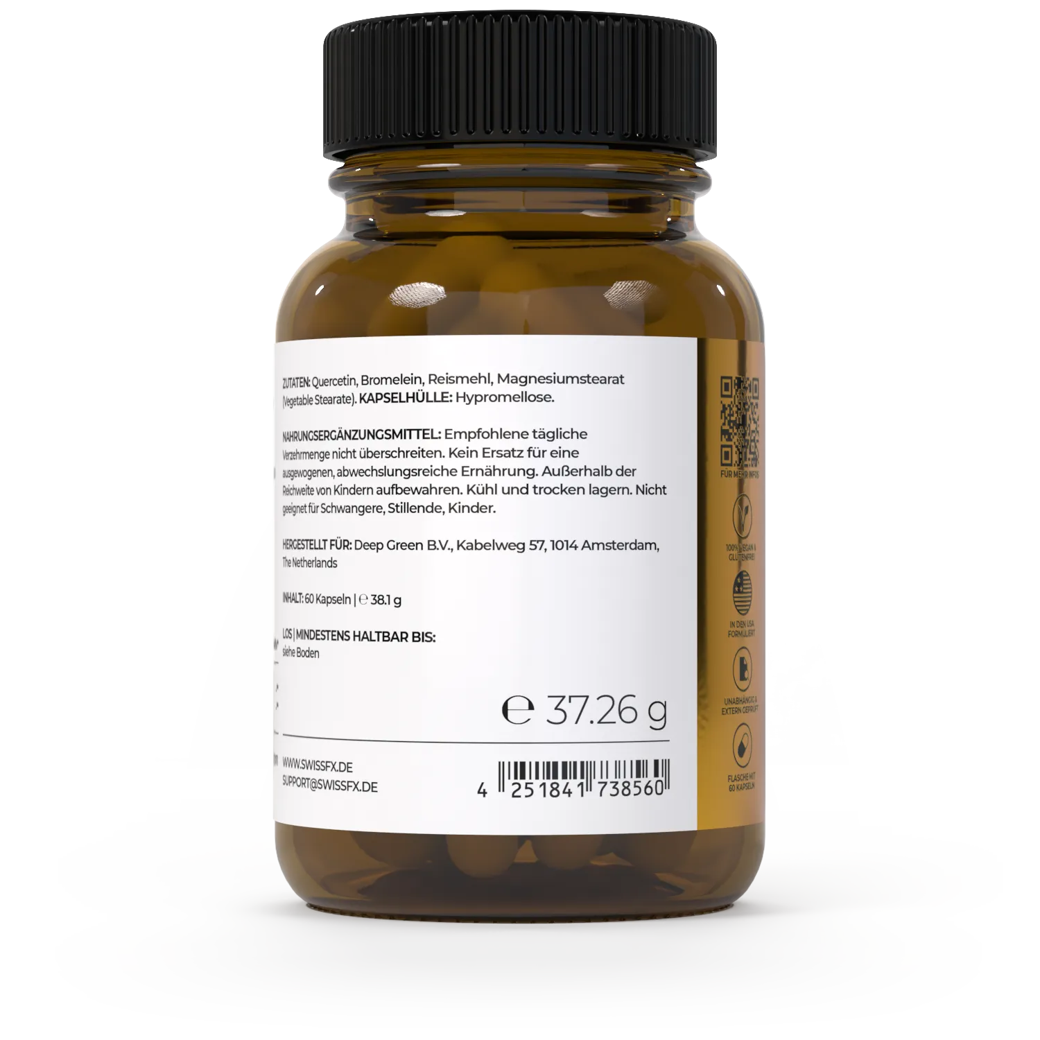 Unsere Quercetin Kapseln stehen für höchste Reinheit, Wirksamkeit und Transparenz. Jede Charge wird von unabhängigen Laboren geprüft, um Reinheit, Gehalt und Sicherheit zu gewährleisten. Wir verwenden ausschließlich pflanzliche Inhaltsstoffe aus geprüften Quellen und verzichten konsequent auf künstliche Farb-, Füll- oder Konservierungsstoffe.