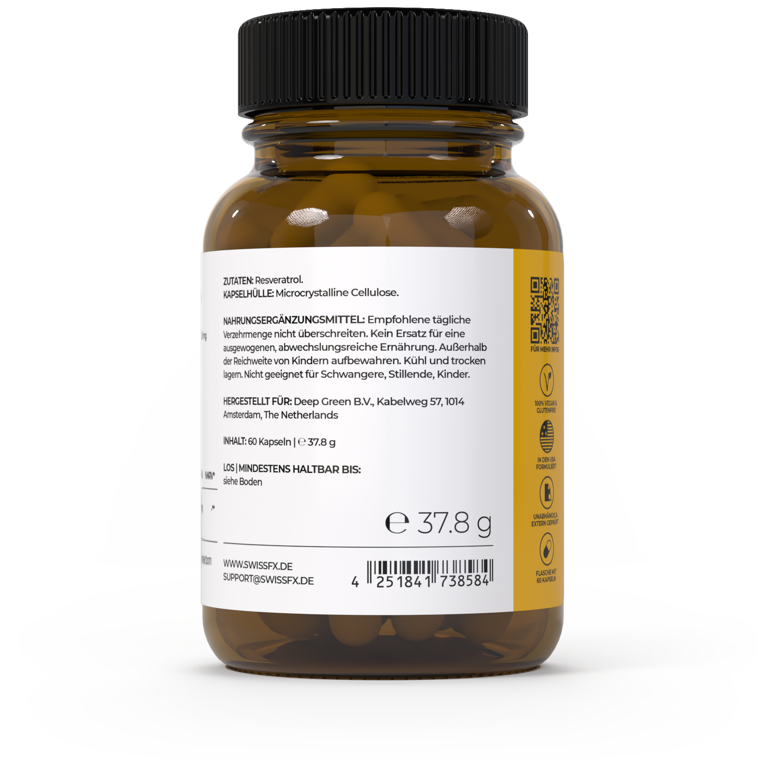 - Hochkonzentriert & bioaktiv: 600 mg Resveratrol, davon 50 % Trans-Resveratrol