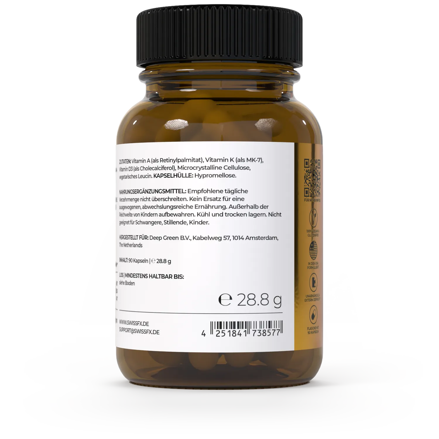 Vitamin D3 fördert die Kalziumaufnahme und hilft, ein stabiles Knochengerüst zu erhalten. Vitamin K2 sorgt dafür, dass Kalzium gezielt in den Knochen eingelagert und nicht in Gefäßen abgelagert wird. Vitamin A ergänzt diese Wirkung durch seine Bedeutung für Sehkraft, Hautgesundheit und Zellschutz. Gemeinsam fördern die drei Vitamine ein starkes Immunsystem, mehr Energie und ein ausgeglichenes Wohlbefinden.